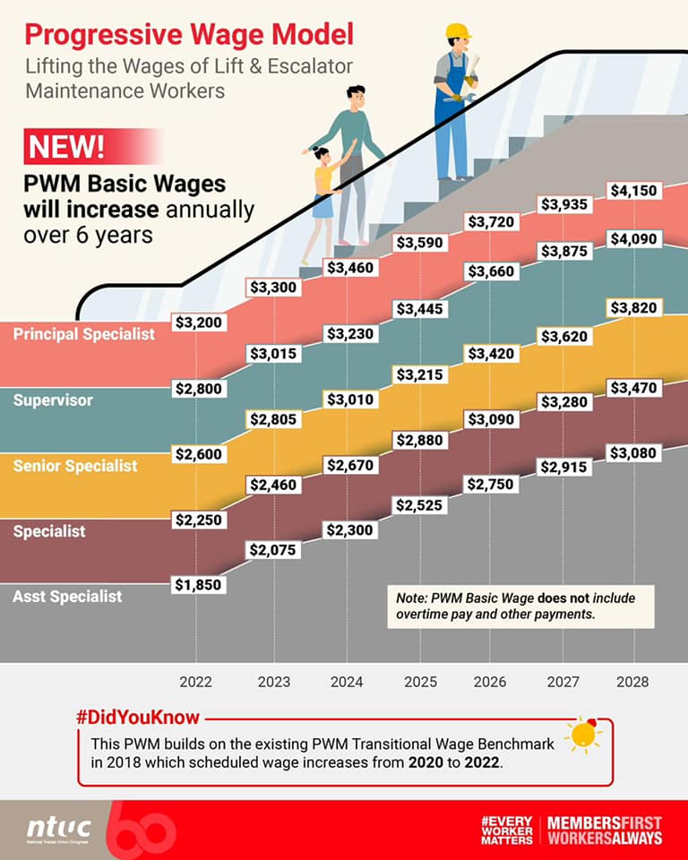 Правительство Сингапура согласилось с рекомендациями TCLE, касающимися прогрессивной модели оплаты труда (PWM) для работников лифтовой и эскалаторной промышленности. Применение этой модели существенно увеличит базовую заработную плату помощника специалиста – с 1480 сингапурских долларов (1097 долларов США) в 2021 году до 1850 сингапурских долларов (1371 доллар США) в 2022 году и постепенно до 3080 сингапурских долларов (2283 доллара США) к 2028 году.